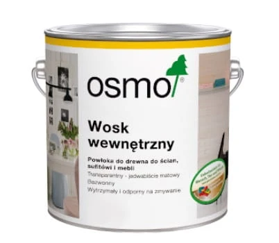 Zastosowanie: Wosk Wewnętrzny Osmo jest przeznaczony do zabezpieczania i dekoracyjnego wykańczania drewna we wnętrzach: paneli ściennych i sufitowych, listew, a także mebli, drzwi oraz zabawek dla dzieci. Zalecany również do renowacji i napraw drewna oraz starych paneli sufitowych fabrycznie wykończonych Woskiem Wewnętrznym Osmo: Białym Transparentnym (7393) lub Białym Kryjącym (7394)